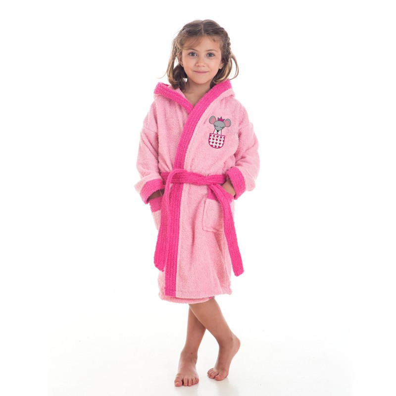 Albornoz infantil con capucha en tonos rosa claro y fucsia, confeccionado en suave tejido de rizo 100% algodón. Ofrece máxima comodidad y calidez después del baño. Cuenta con cinturón ajustable, bolsillo delantero y un simpático bordado de ratoncita en el pecho.