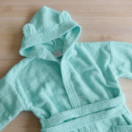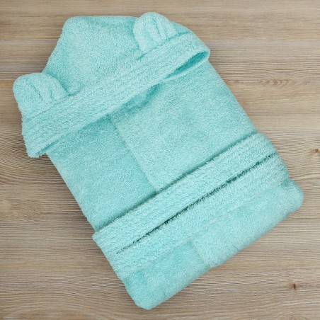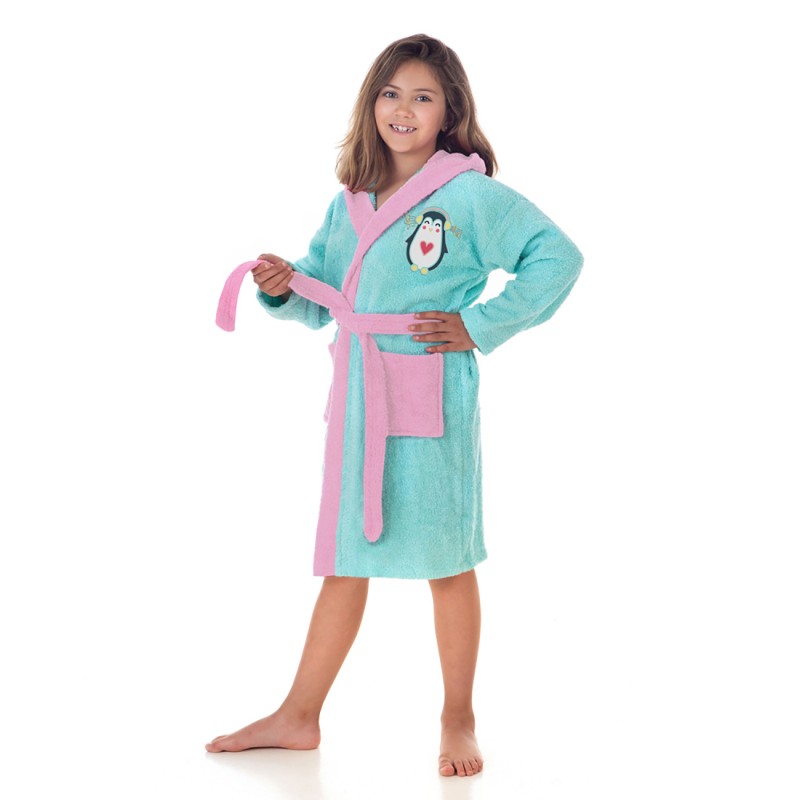 Albornoz infantil con capucha en color turquesa y detalles rosa, confeccionado en suave rizo 100% algodón. Diseñado para ofrecer confort y calidez después del baño. Incluye cinturón ajustable, bolsillo frontal y un divertido bordado de pingüino en el pecho. Ideal para el uso diario.