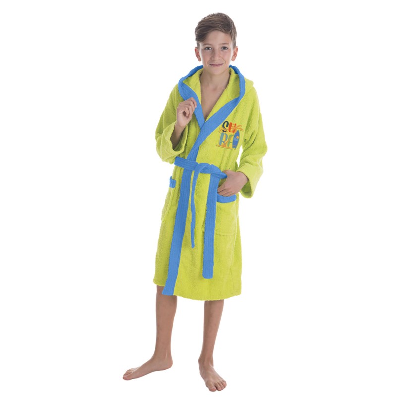 Albornoz juvenil en alegre color verde lima con detalles en azul. Cuenta con capucha, cinturón y un divertido estampado veraniego. Ideal para después del baño o piscina.