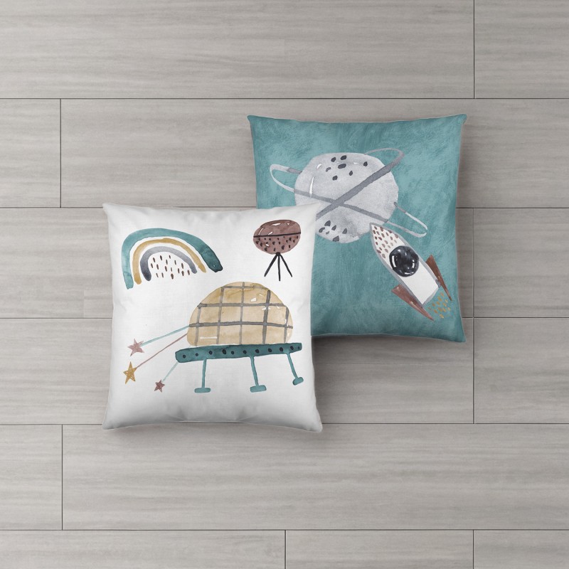 Este cojín reversible ROCKET es ideal para decorar el dormitorio de los más pequeños de la casa, sobre todo para completar la colección. Es un modelo con un tacto suave y agradable, con un tejido 100% algodón y con un dibujo diferente en cada cara.