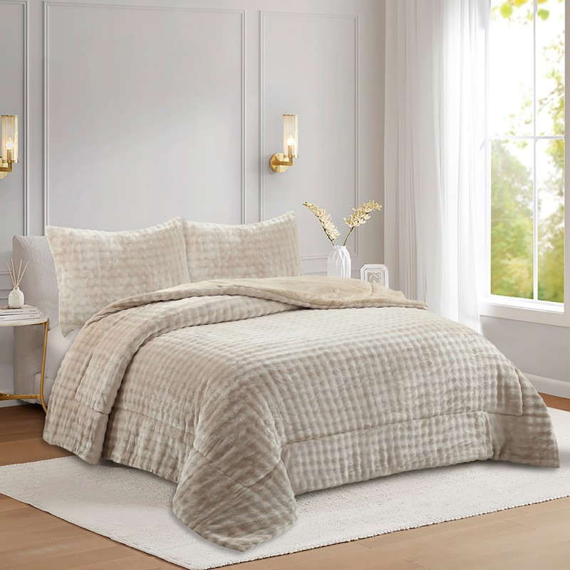 Edredón de microlina flannel, tiene un diseño sencillo simulando una textura o estampado. Es muy suave y acogedor para cualquier tipo de ambiente. Este edredón es perfecto para darle un toque a su habitación. Disponible en 2 colores.