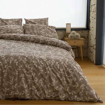Funda nórdica en tono café, rosado y verde con estampado vegetal, de estilo natural y elegante. Ideal para crear un ambiente cálido y acogedor en el dormitorio.