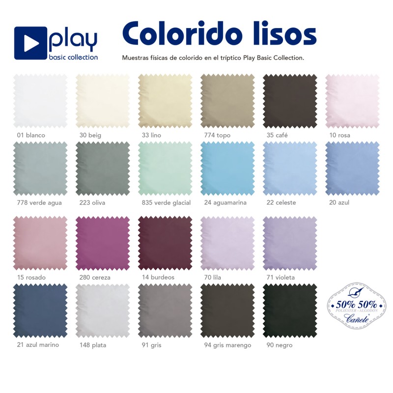 Disponible en 22 colores: Blanco, Beig, Lino, Topo, Burdeos, Café, Rosa, Cereza, Lila, Violeta, Rosado, Aguamarina, Verde Glacial, Verde Agua, Oliva, Celeste, Azul, Azul Marino, Plata, Gris, Gris Marengo y Negro.